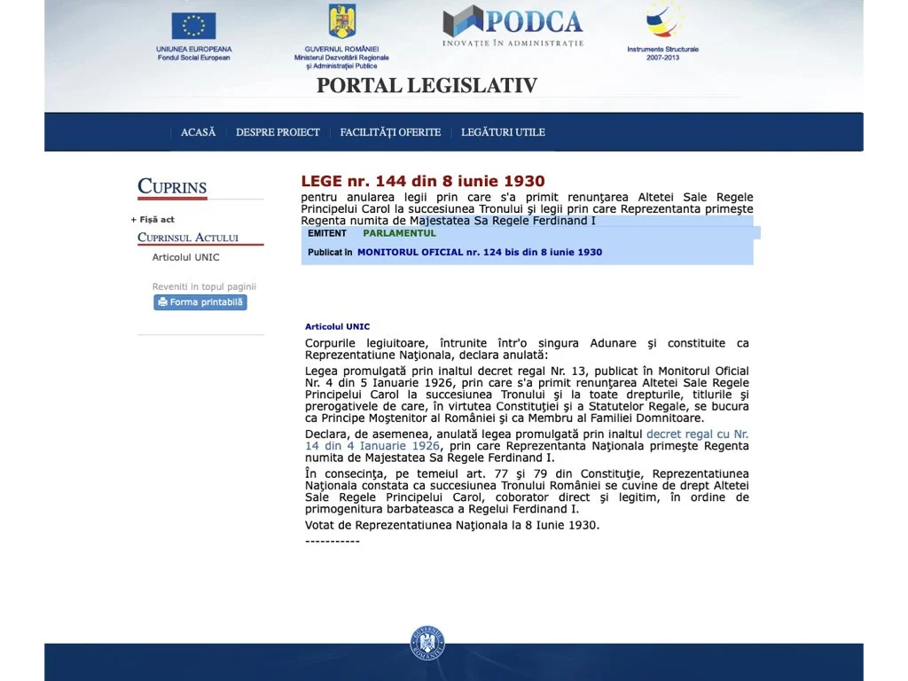 Law promulgated by the Superior Royal Decree No. 13, published in the Official Gazette No. 4 of January 5, 1926, by which was received the renunciation of His Royal Highness Prince Charles to the succession to the Throne and to all the rights, titles and prerogatives he enjoyed, under the Constitution and the Royal Statutes, as Crown Prince of Romania and as a member of the reigning family.